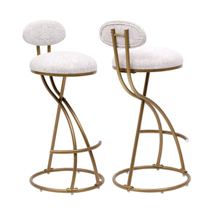 Enhance your kitchen or bar space with the modern gold bar stools set of 2 from MLNshops. Each stool features a sleek S-shaped gold frame that stands out in any room. These stools combine style and comfort with a backrest and soft, floral print upholstery. The design brings elegance and a contemporary feel to your home.
