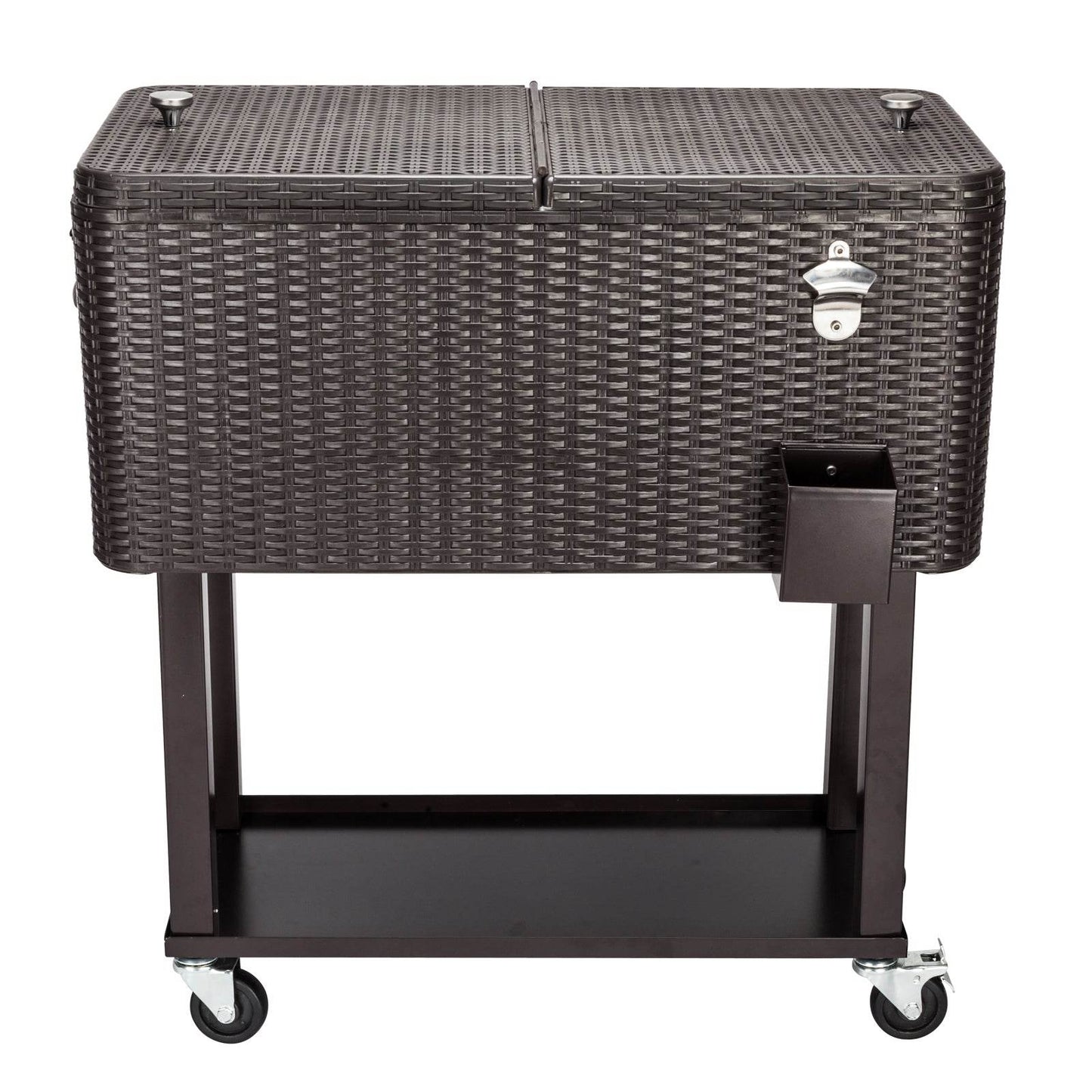 This spacious rattan cooler with wheels holds up to 80 quarts. That’s plenty of space for drinks and snacks to keep your guests happy. The convenient shelving underneath offers additional storage, keeping your essentials within reach.